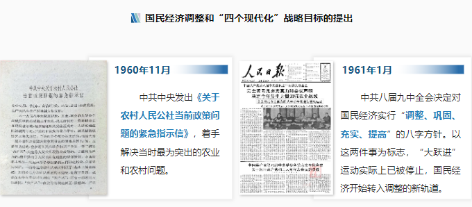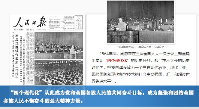 当国民经济调整工作取得巨大成就的时候,党适时提出了新的奋斗目标。1964年底,周恩来在三届全国人大一次会议上郑重提出实现“四个现代化”的历史任务,即“在不太长的历史时期内,把我国建设成为一个具有现代农业、现代工业、现代国防和现代科学技术的社会主义强国,赶上和超过世界先进水平”。中央还确定分两步走实现现代化的战略构想,即从第三个五年计划开始,第一步,经过三个五年计划时期,建立一个独立的比较完整的工业体系和国民经济体系; 第二步,全面实现农业、工业、国防和科学技术的现代化,使中国经济走在世界前列。“四个现代化”从此成为党和全国各族人民的共同奋斗目标,成为凝聚和团结全国各族人民不懈奋斗的强大精神力量。