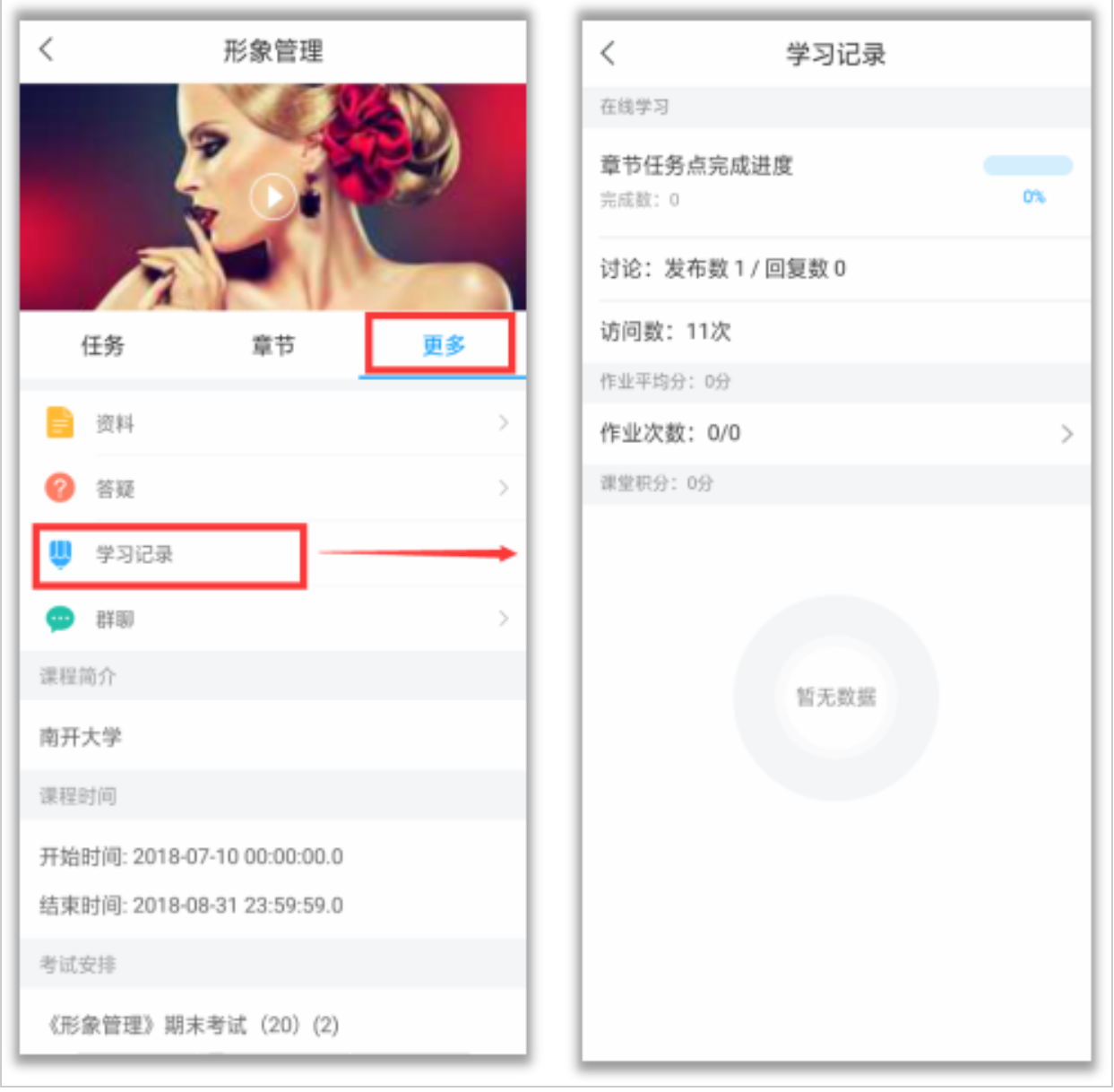 在“更多”——“学习记录”,可以查看自己课程学习的进度、作业平均分、课堂积分等等。