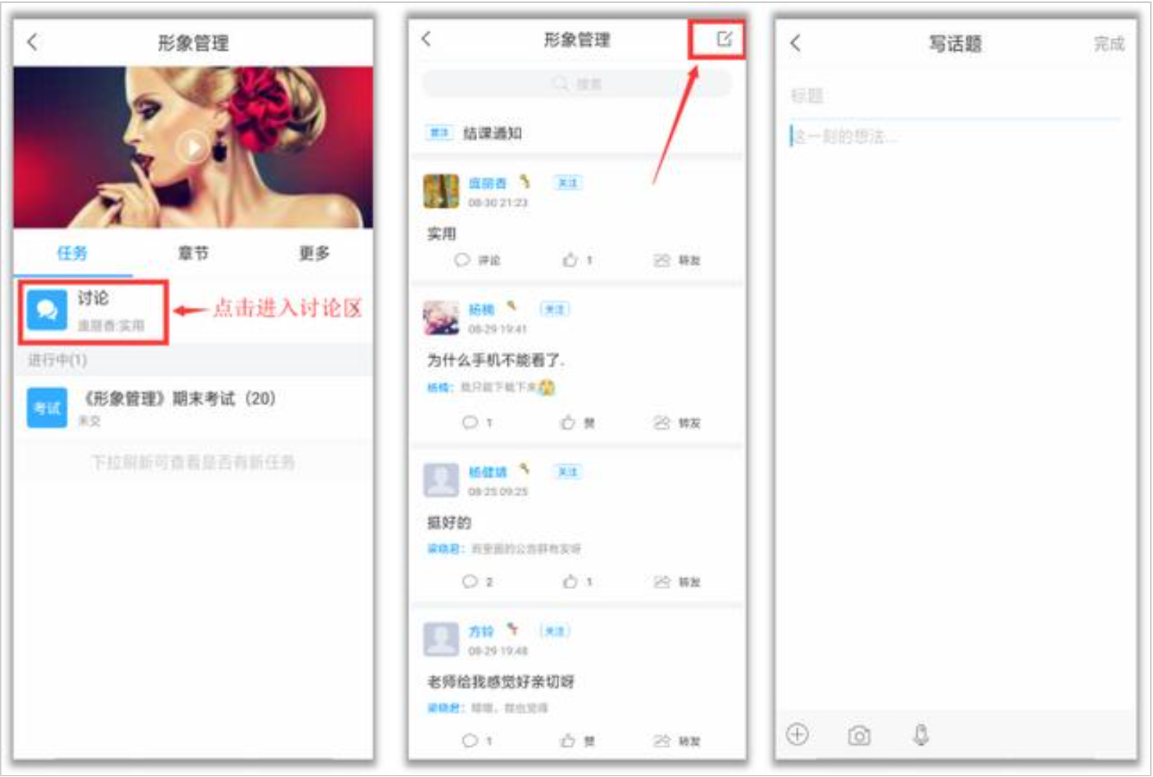 在“任务”栏,点击“讨论”,即可进入课程讨论区。在讨论区点击右上方的编辑按钮,编辑话题,就可以和老师、同学们一起交流分享自己的学习心得啦。