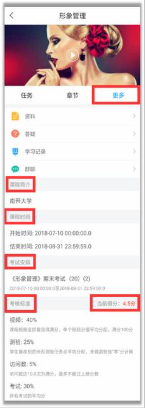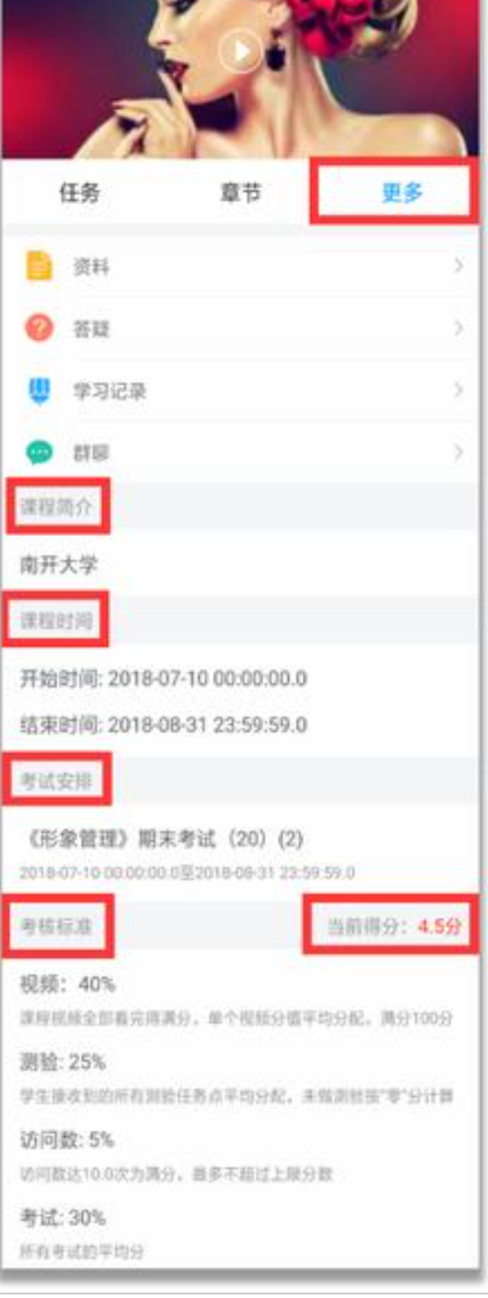 在“更多”可以查看课程简介、课程时间、考试安排、考核标准和当前课程的分。
