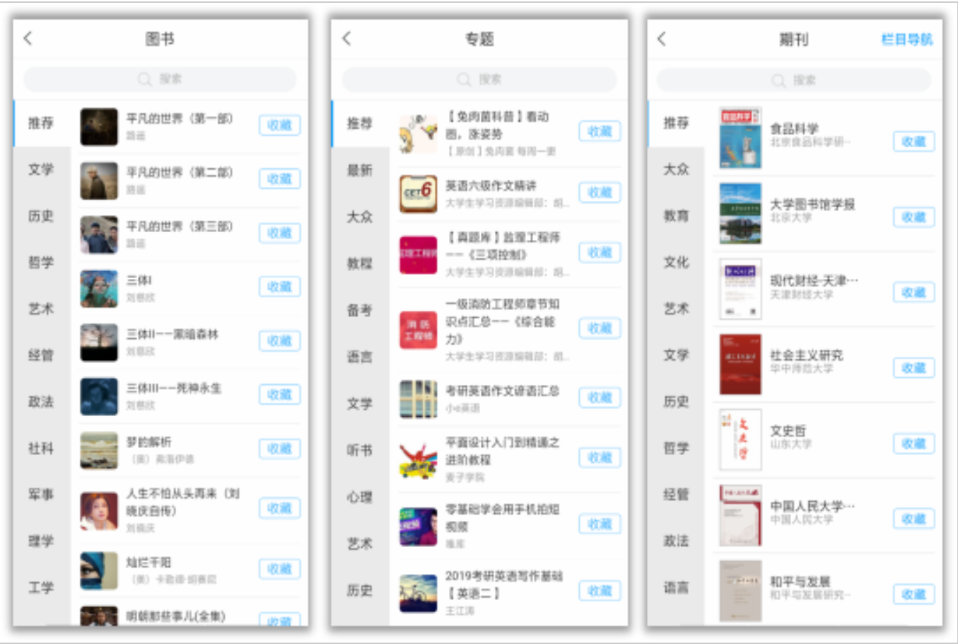 图书、专题、期刊、报纸、讲座、学术名栏等等。。。学习通在手,足不出户也能带你遨游书海~~