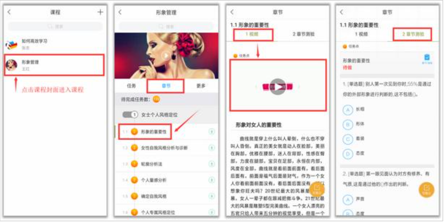 点课程封面,即可进入课程学习界面。在“章节”点击任一小标题,即可开始观看这一小节的教学视频,完成相应章节测验。