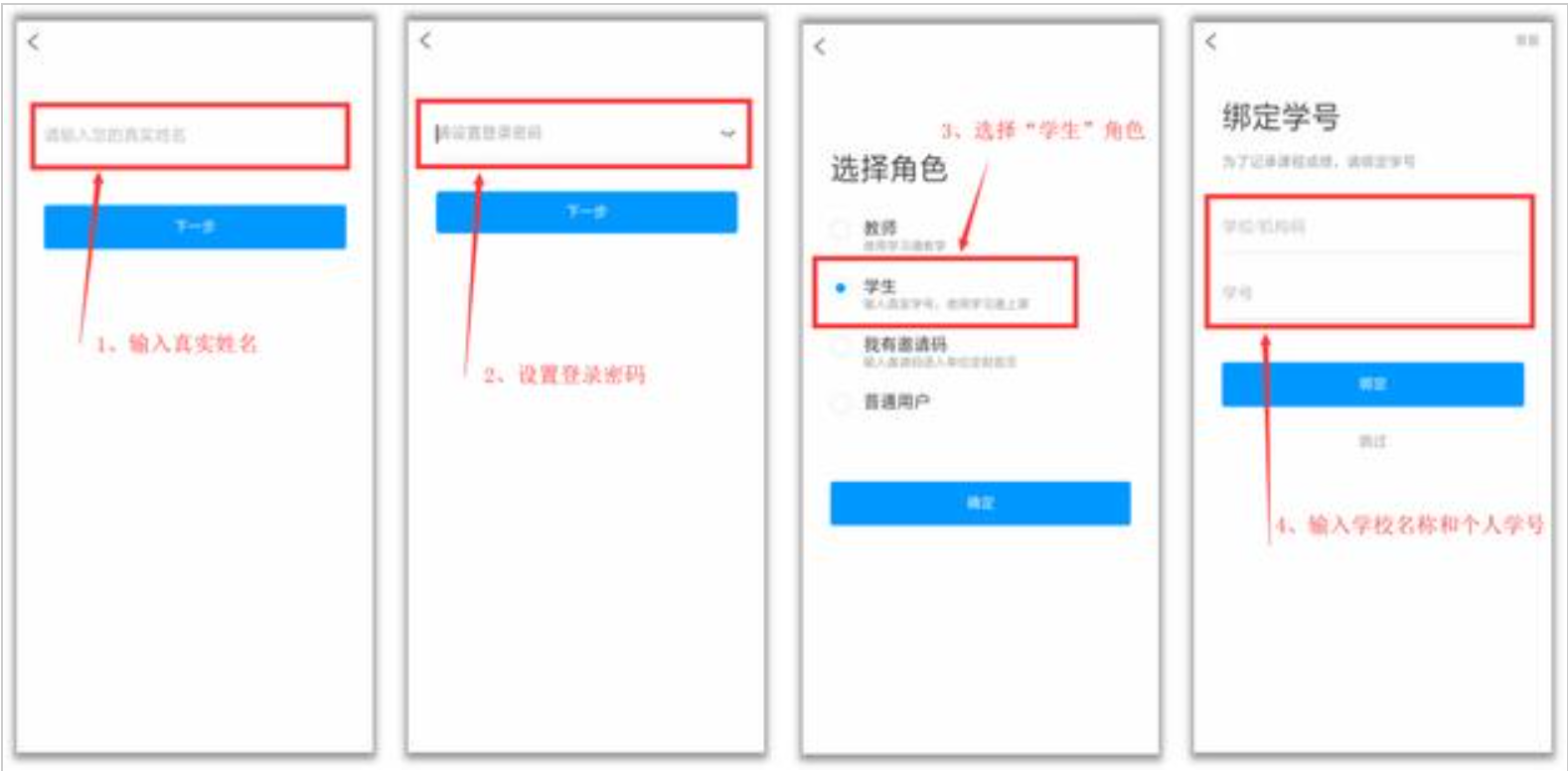 获取验证码后,填写个人真实姓名、设置登录密码,选择角色“学生”,绑定学号即可。