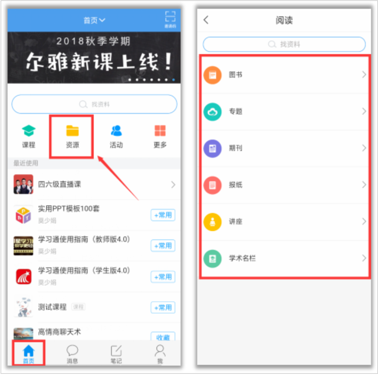 在学习通“首页”——“资源”,海量的阅读资源,任你搜索~