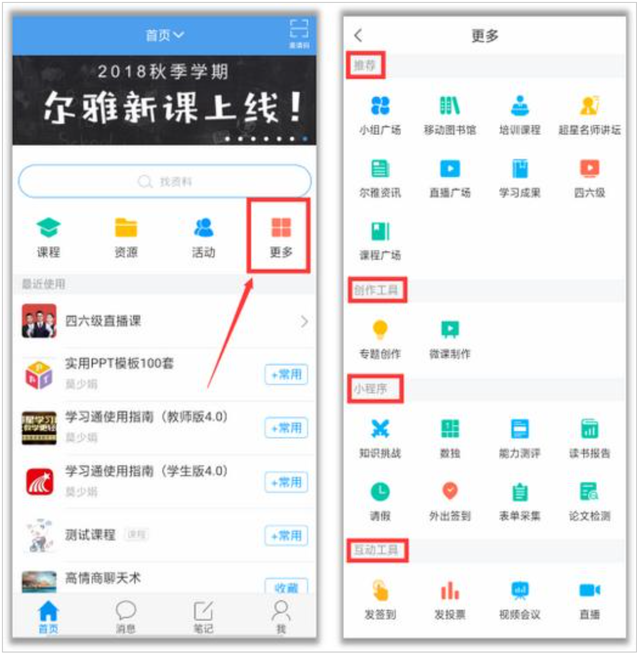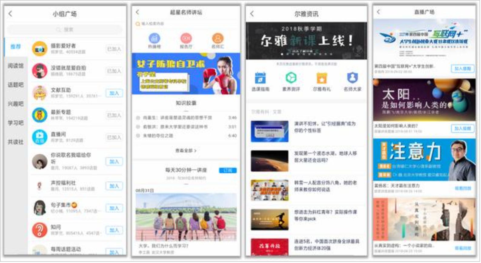 【推荐】小组广场、移动图书馆、培训课程、超星名师讲坛、尔雅资讯、直播广场、学习成果、四六级、课程广场