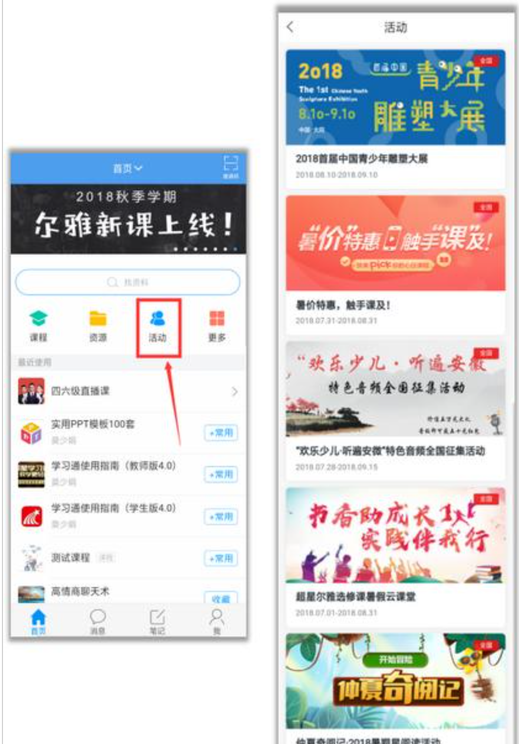 在学习通“首页”——“活动”,查看活动列表,动动小手指就能了解和参与活动~