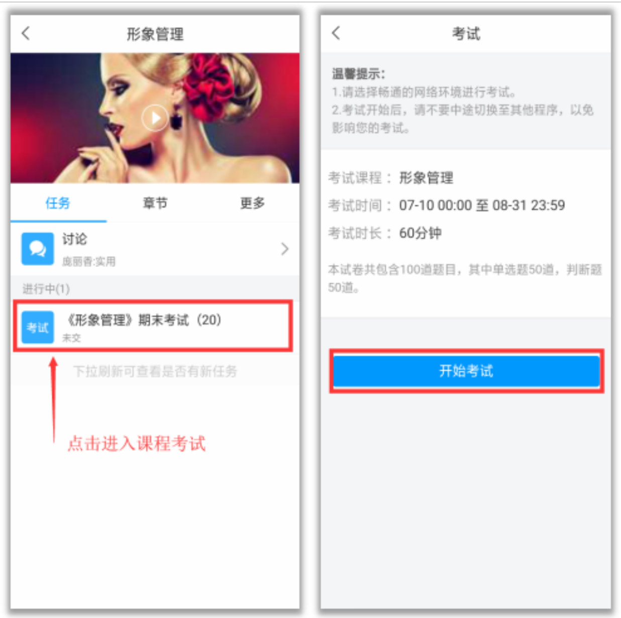 在“任务”栏——“考试”,可以看到课程考试的相关信息,点击“开始考试”就可以啦!