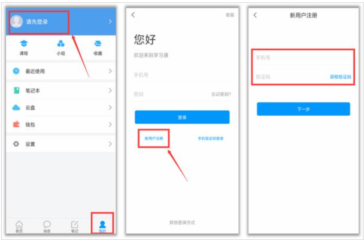 打开安装好的学习通App,可以看到如下图左的应用首页,点击右下角的“我的”,进入如下中图的界面,点击上方灰色头像,进入注册登录界面,选择“新用户注册”,输入手机号并获取验证码。