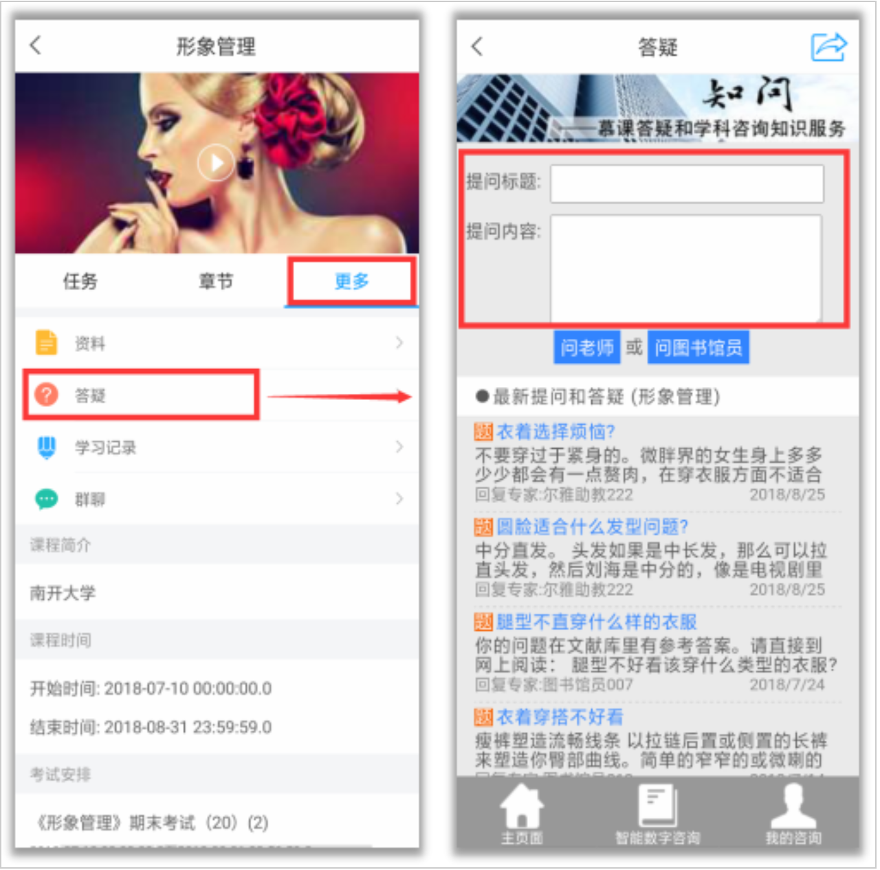 如果同学们在学习中遇到有关于课程内容的问题,在“更多”——“答疑”进行提问,会有专业的助教老师为大家解答。