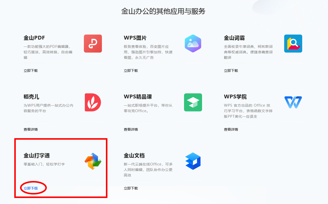 访问网站https://www.wps.cn/,进入主页后找到下图红色边框标识出来的“金山打字通”点击下方立即下载。