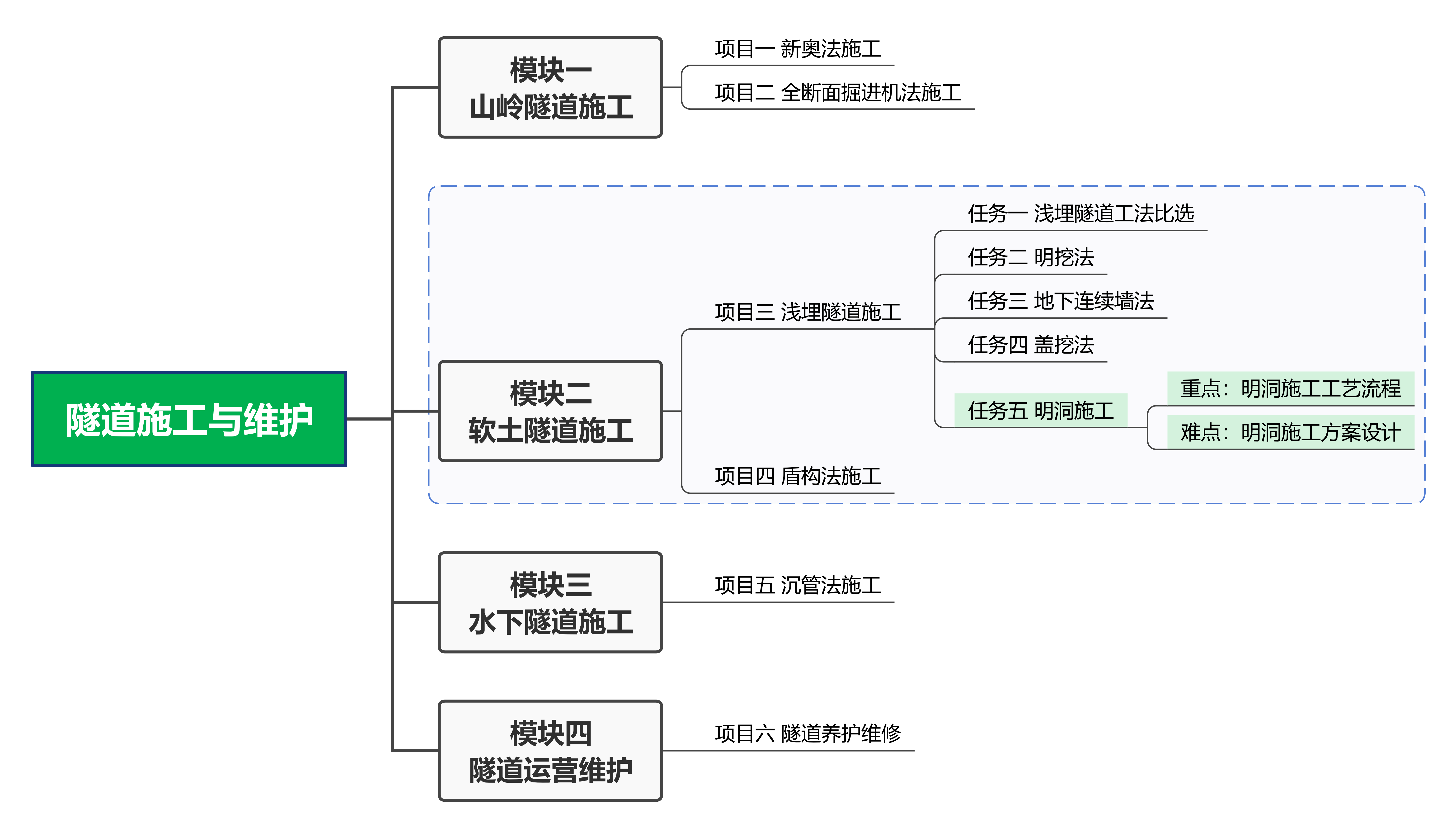 通过网络搜索图片、查阅相关隧道资料熟悉‘自主学习任务单’给出的隧道开挖方法、明挖法特点,熟悉明洞的不同类型。