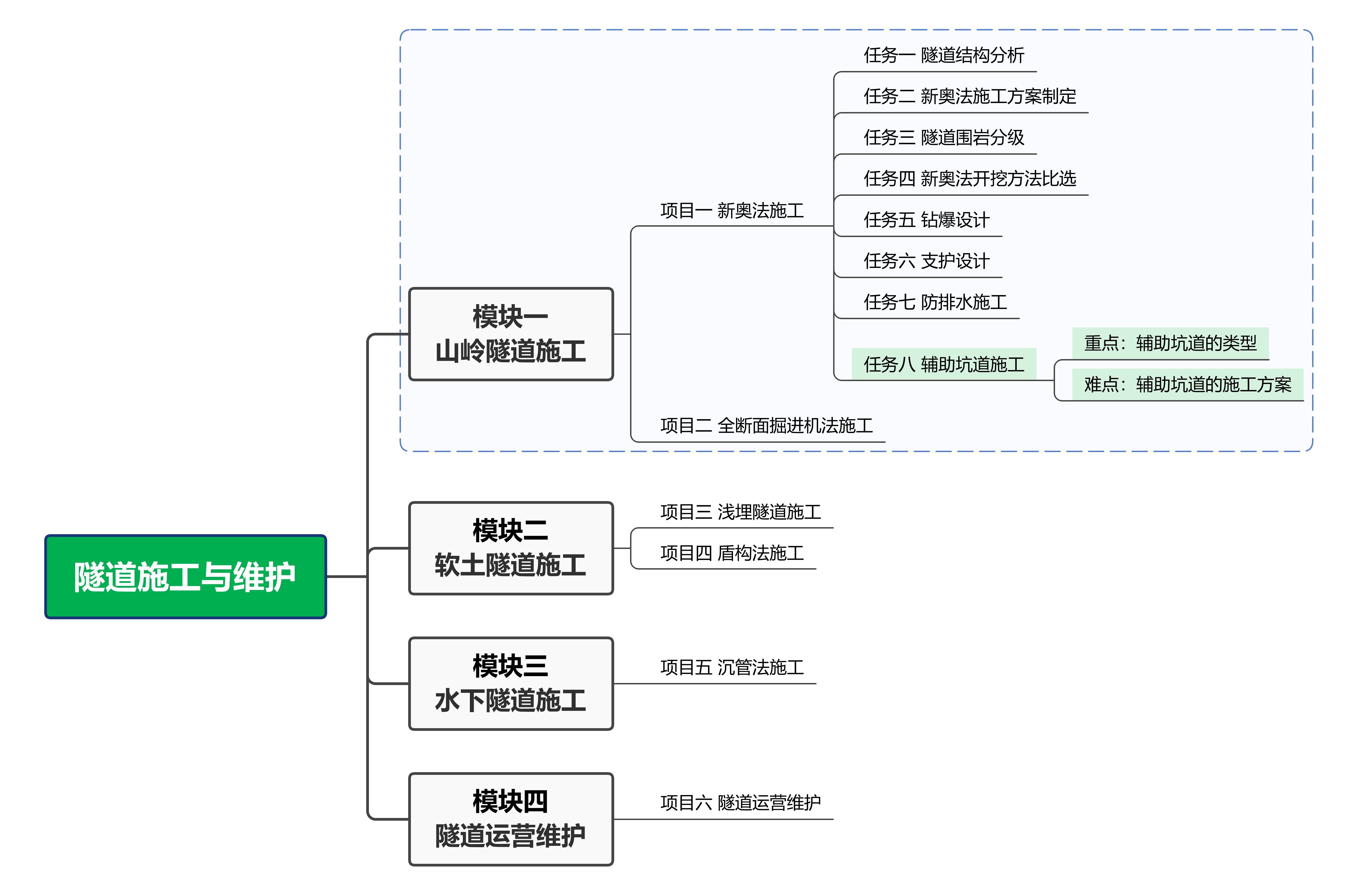 本单元需要同学们了解新奥法施工中隧道辅助坑道的类型和施工方法,尤其是不同的辅助坑道的作用及其适用条件,并且能够对不同的隧道进行辅助坑道设计。