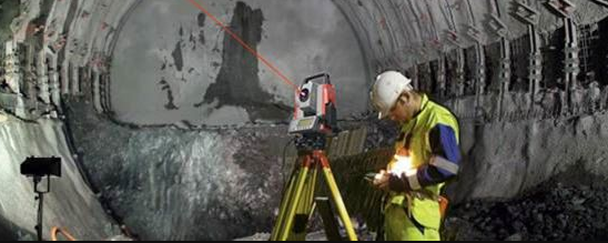 架设好施工控制网后,就是相应的施工放样了。放样同木工弹墨线或者家中装修时的划线一样,是引导施工队伍进行施工的工作。在隧道掘进过程中既要指示掘进的方向,又要标定隧道的中线和腰线,这就限定了隧道施工的界线,也就是所谓指哪儿打哪儿。只不过,由于隧道的特殊环境,电磁波难以穿透厚厚的岩壁,所以不能用现代测量最常用的RTK(实时动态差分技术)等GPS测量方法,一般常用全站仪等光电测量设备,完成平面测量和水准测量。