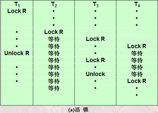 活锁:事务T1封锁了数据Rv事务T2又请求封锁R,于是T2等待。T3也请求封锁R,当T1释放了R上的封锁之后系统首先批准了T3的请求,T2仍然等待。T4又请求封锁R,当T3释放了R上的封锁之后系统又批准了T4的请求……T2有可能永远等待,这就是活锁的情形。
