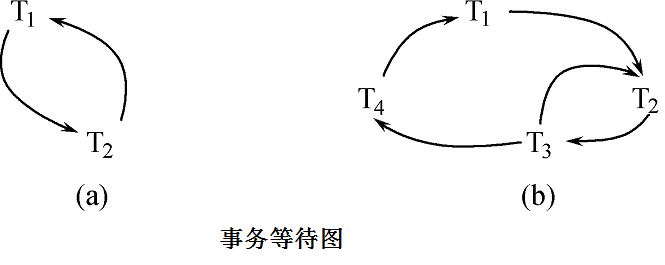 图(a)中,事务T1等待T2,T2等待T1,产生了死锁。图(b)中,事务T1等待T2,T2等待T3,T3等待T4,T4又等待T1,产生了死锁。图(b)中,事务T3可能还等待T2,在大回路中又有小的回路。
