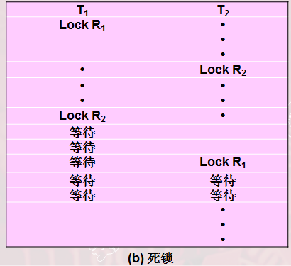 死锁:事务T1封锁了数据R1;T2封锁了数据R2,T1又请求封锁R2,因T2已封锁了R2,于是T1等待T2释放R2上的锁。接着T2又申请封锁R1,因T1已封锁了R1,T2也只能等待T1释放R1上的锁。这样T1在等待T2,而T2又在等待T1,T1和T2两个事务永远不能结束,形成死锁。