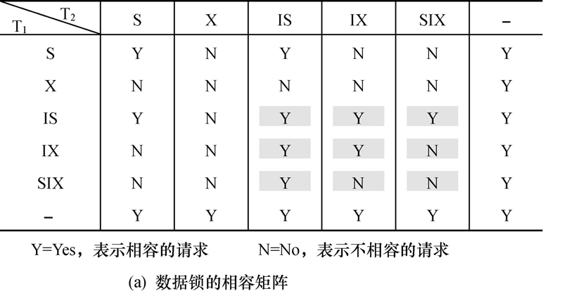 【例】对某个表加SIX锁,则表示该事务要读整个表(所以要对该表加S锁),同时会更新个别元组(所以要对该表加IX锁)。