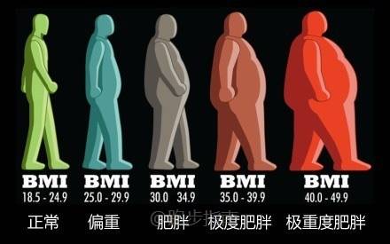 1. 正常:18.5~24.9;偏重体型:25~29.9;肥胖:30~34.9;极度肥胖体型:>35; 消瘦体型: <18.5