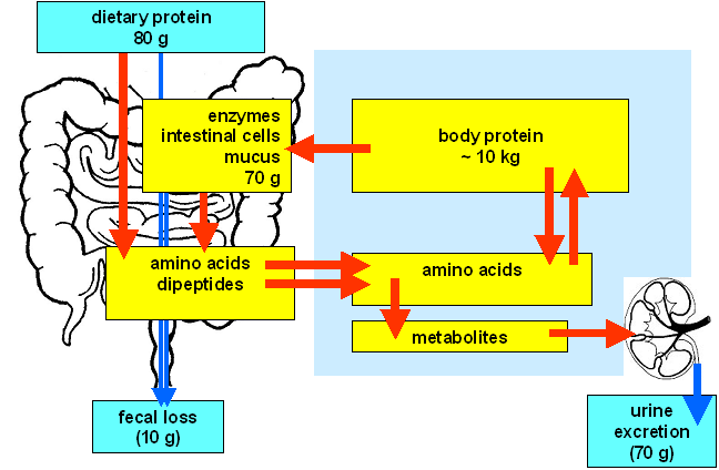 B. 吸收:蛋白质经过小肠腔内的消化,被水解为可被吸收的氨基酸和2~3个氨基酸的小肽,这些都可以被吸收,被吸收的氢基酸通过肠粘膜细胞进入肝门静脉,被运输到肝脏和其他组织或器官被利用。