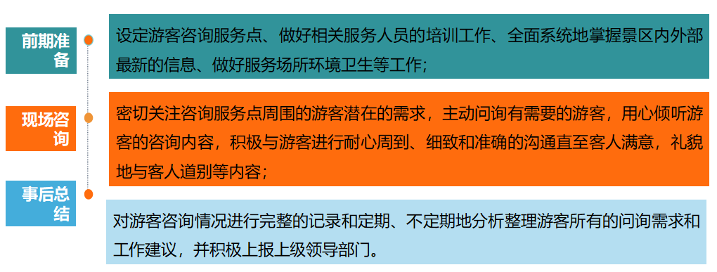 现场咨询服务具有咨询内容广泛、游客期望值较高、服务引导性强等特点,现场咨询服务流程包括: