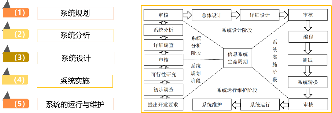 (3)结构化方法系统开发一般是严格的线性结构,各项工作依照先后顺序依次展开,一旦某项环节出现问题而又未能及时发现,会导致后面的所有环节都建立在错误的基础之上,最终产生严重的后果。