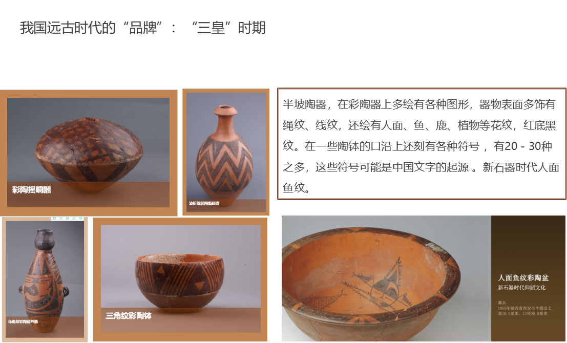 “三皇”时期 | 华夏先民已开始在陶器上作画,使用各种标记符号。 |