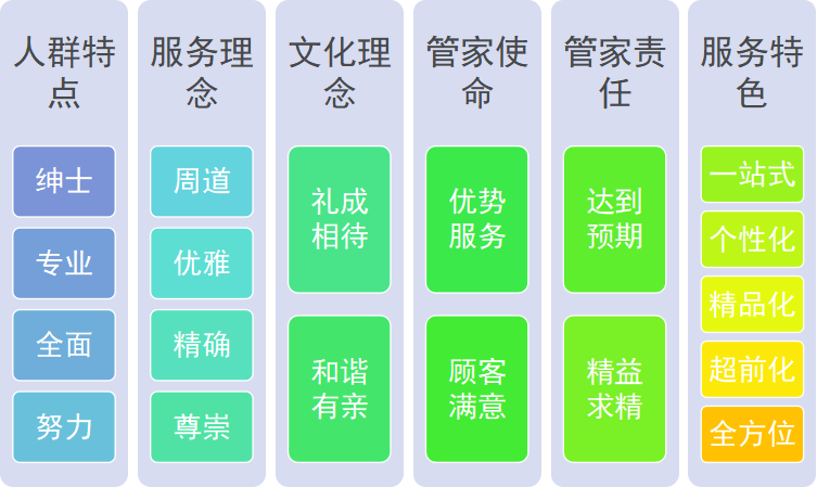 以“契约精神、和谐精神、诚信服务精神”为基础,以“精细、周到、圆满、美好、优雅”的服务为依托,以“仁、义、礼、智、信”的价值观为内核,打造“和合力行、集美聚善”的皇金管家服务品牌精神。