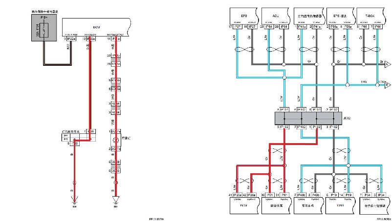 步骤3:检测灯光组合开关IP38端子5 与BCM IP20a端子10 之间的线路。关闭点火开关,用万用表测量灯光组合开关IP38端子5 与BCM IP20a端子10之间的电阻值,判断是否正常?