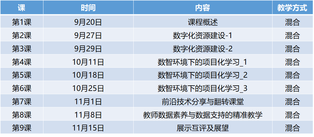 在面对技术赋能的学习内容时,希望我们的教学方式也是充满创新要素的。在接下来的九周里,我们将采取“同步面授+异步学习(在线课程、讨论等)"的混合学习模式。采用异步学习的方式,就是要给各位同学更多的学习弹性来自主学习,而在同步课堂上,我们会有更多互动、交流的时间。这样一来,我们每次三课时的课,有两课时是面对面完成的(每周五下午1:00-2:30),还有一课时是在线完成。
