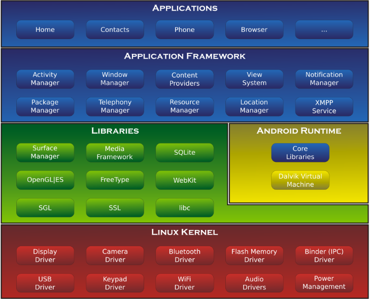 Android 采用 Java 作为开发语言,在其运行时中包含了 Java 核心库的大多数功能,并使每一个 Android 应用程序都在它自己的进程中运行,都拥有一个独立的 Dalvik 虚拟机实例。Dalvik 可以保证一个设备可以同时高效地运行多个虚拟系统。