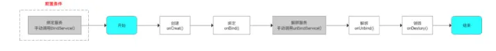 绑定模式:第一次 bindService()的时候,执行的方法为 onCreate()、 onBind()解除绑定的时候会执行 onUnbind()、onDestory()。