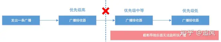 有序广播:从名字上就可以看出来这是一种按照顺序执行广播的方式,它意味着在广播发出之后,同一时刻只有一个广播接收器能够收到广播。并且优先级高的广播接收器最先接收到广播。除此之外,接收到广播的接收器还可以选择截断正在传递的广播,后续的广播接收器就没法收到这条传递的广播了。它的结构图如下: