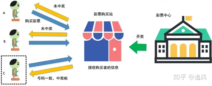在先回答这些问题之前,我们可以先通过一个现实生活中常见的例子,来帮助我们理解后续的概念。自己画了个图,以买彩票为例,用买彩票再兑奖的过程类比学习广播机制。