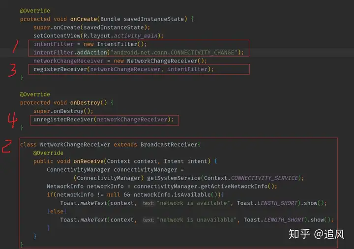 动态注册:指的是在程序代码中进行广播注册的过程。下图展示了基于动态注册方式的广播代码结构。