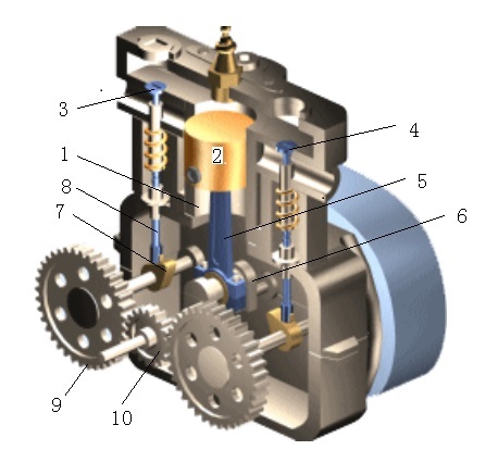 机器的主体是由各种不同的机构组成,可以是一个机构,也可以是包含若干个机构。用来传递运动和力、以一个构件为机架、用构件间能够相对运动的连接方式组成的构件系统称为机构。一般情况下,为了传递运动和力,机构各构件间应具有确定的相对运动。以图1.1所示的单缸四冲程内燃机为例,活塞2、连杆5、曲轴6和汽缸体1组成了曲柄滑块机构,将活塞的往复运动变成了曲柄的连续运动。凸轮7、顶杆8和汽缸体1组成了凸轮机构,将凸轮轴的连续运动变为顶杆规律性的间歇运动。曲轴6和凸轮轴上的齿轮9、10等与汽缸体1组成齿轮机构,使两轴保持一定的速比。