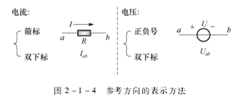 参考方向又叫做假定方向或正方向,这是分析与计算电路的一种方法。在参考方向下,与参考方向一致的,物理量取正;与参考方向相反的,物理量取负,表示方法如图 2-1-4所示。