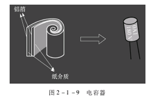 两个相互绝缘又相互靠得很近的导体就组成了一个电容器,如图2-1-9所示。这两个导体称为电容器的两个极板,中间的绝缘材料称为电容器的介质。