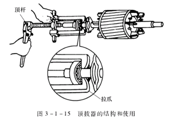 俗称拉具,分为双爪和三爪两种,是拆卸皮带轮和轴承等的专用工具。顶拔器形状和使用方法如图3-1-15所示。