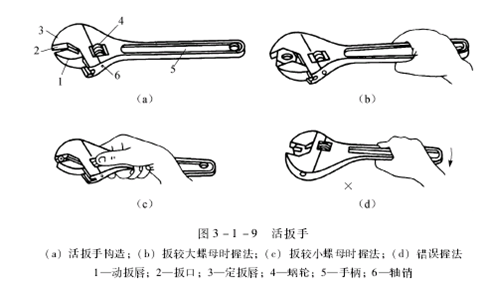 活扳手是用来拧动螺母或螺栓的工具。如图3-1-9(a)所示,活扳手由动扳唇、扳口、定扳唇、蜗轮、手柄和轴销六部分组成。