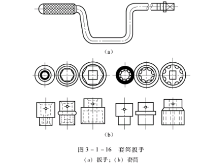 套筒扳手用来拧紧或拧松沉孔螺母,或在无法使用活动扳手的地方使用。由套筒和手柄两部分组成,套筒的选用应适合螺母的大小,如图3-1-16所示。