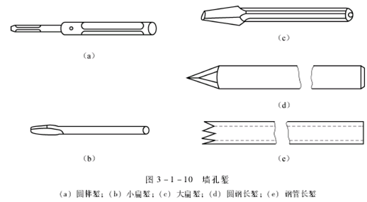 (4)长錾:图3-1-10(d)为圆钢长錾,用来錾打混凝土墙上通孔。