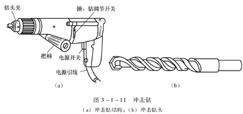 冲击钻是一种电动工具,如图3-1-11(a)所示,可以作 “电钻”也可作“电锤”使用。使用时只需要调至相应的挡位即可。