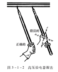 ③进行验电操作的人员要戴上符合要求的绝缘手套,并且握法要正确。如图3-1-2所示。