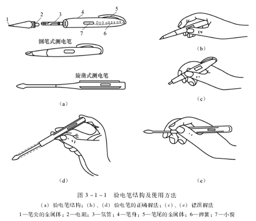 ①必须按照图3-1-1所示方法握妥笔身,并使氖管小窗(数显测电笔为液晶屏)背光朝向自己,以便于观察。