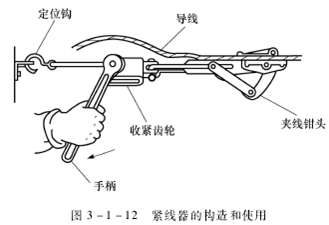 使用时定位钩必须勾住架线支架或横担,夹线钳头夹住需收紧导线的端部,然后扳动手柄,逐步收紧。