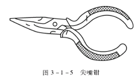 尖嘴钳的头部尖细,适用于在狭小的工作空间操作。其刀口能剪断细小金属丝,夹持较小零件,弯折导线等。尖嘴钳的外形如图3-1-5所示。