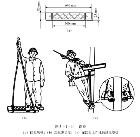 又叫踏板,用来攀登电杆。蹬板的规格如图3-1-14(a)所示,绳的长度一般应保持一人一手长,如图3-1-14(b)所示。
