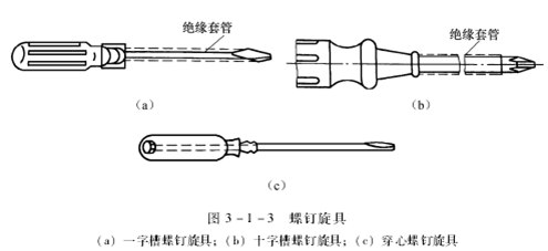 一字形螺丝刀用来紧固或拆卸一字槽的螺钉和木螺丝,它有木柄和塑料柄两种。如图3-1-3(a)。