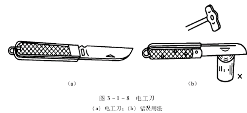 电工刀是用来剥削电线绝缘层、切割木台缺口、削制木桩以及软金属的工具,如图3-1-8所示,由刀身和刀柄组成。常用的规格按刀片长度分为88mm和 112mm两种。
