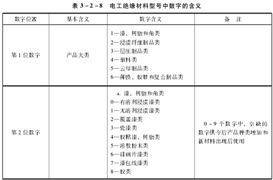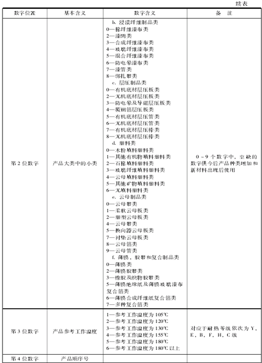 2)绝缘材料的种类和型号电工绝缘材料分为气体、液体和固体三大类。为了全面表示固体电工绝缘材料的类别、品种和耐热等级,用四位数字表示绝缘材料的型号,其格式如下: